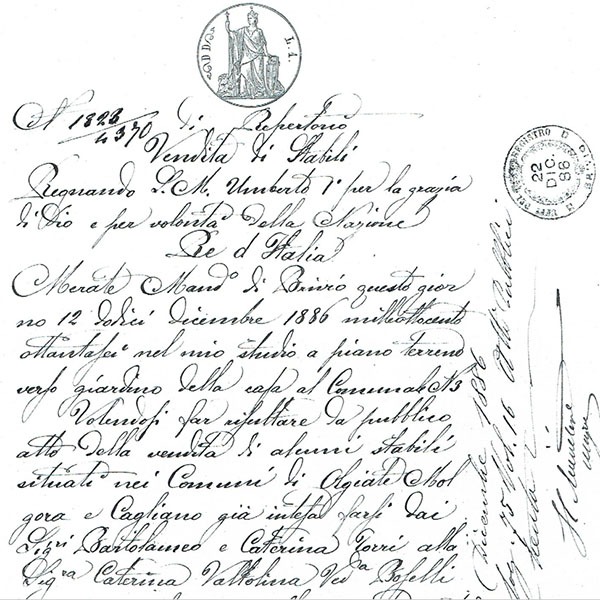 The sale was later formalized by Notary Alessandro Galli of Merate with a deed dated December 12, 1886. Acting as Caterina Voltolina's proxy was Felice Boselli (son of the late Ambrogio).